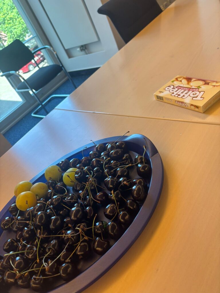 Von den Geburtstagskindern in der Sitzungspause gab’s Kirschen, Süßigkeiten & ein paar gesunde Snacks – Balance muss sein (auch wenn ich Süßes liebe